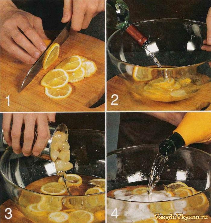Способ приготовления:1 Лимоны вымыть, ошпарить кипятком и нарезать тонкими кружками. Сложить их в крюшонницу или большую стеклянную миску.