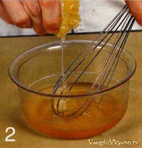 2. Взбить венчиком масло с лимонным соком и медом. Посолить, поперчить. Заправить салат.