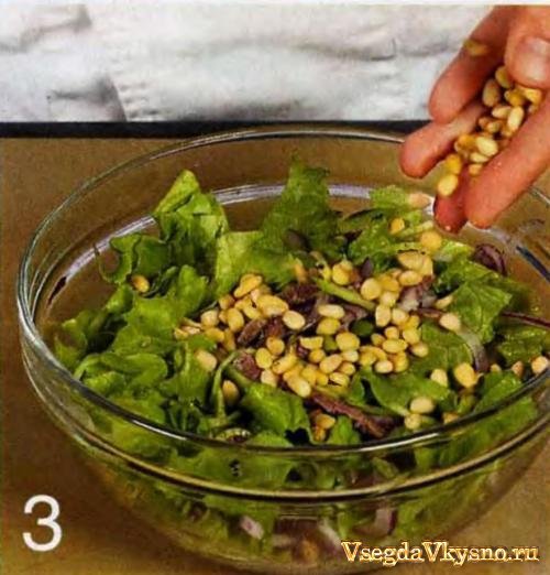 3 . Выложить салат в миску, сверху посыпать кедровыми орешками.