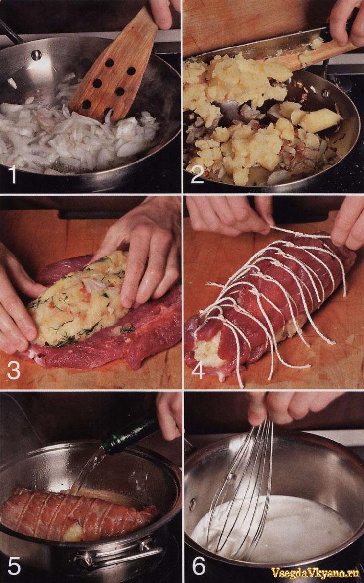 4. Завернуть края мяса внутрь. Плотно перевязать рулет бечевкой.
