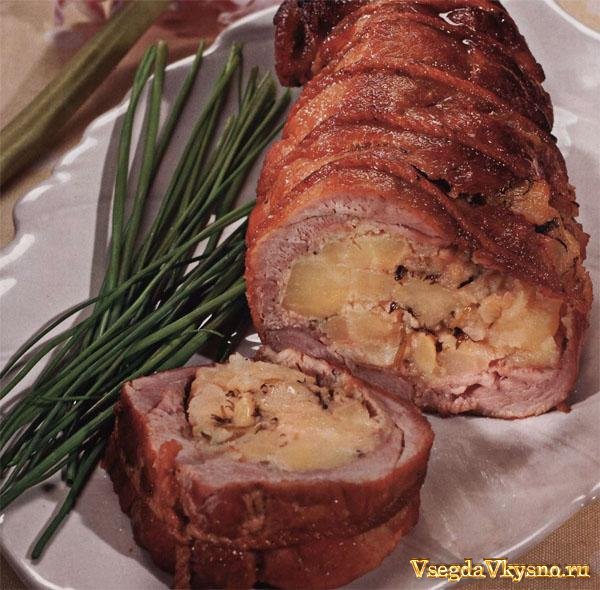 3. Вырезку вымыть, обсушить. Сделать на мясе глубокие насечки вдоль мышечных волокон, накрыть пленкой и отбить в пласт. По центру положить начинку.