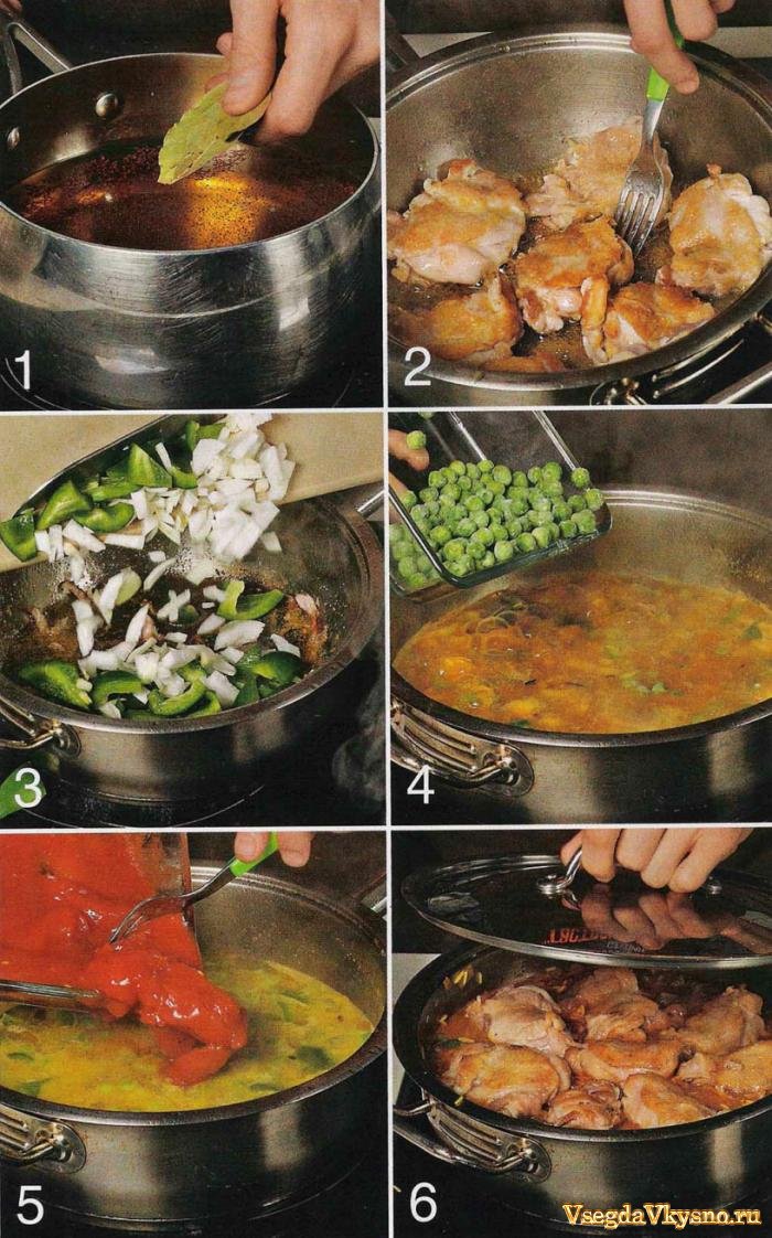 Ингредиенты: 1 кг куриных бедрышек 500 г длиннозерного риса 750 мл куриного бульона 1,5 ч. л. натурального шафрана 3 лавровых листа 3 бутона гвоздики 1 луковица 1 сладкий зеленый перец 3 зубчика чеснока 0,5 ч. л. молотого кумина 0,5 ч. л. молотого кориандра 0,5 ч. л. молотых семян укропа 400 г протертой мякоти томатов 150 г свежезамороженного зеленого горошка 2 ст. л. растительного масла соль, перец
