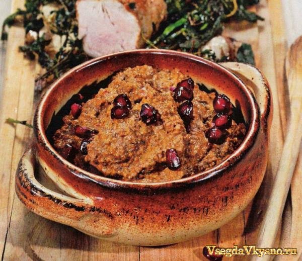 3. Влить гранатовый сок. Посолить по вкусу. Если соус получился очень густой, долить кипяченой воды. У соуса должна быть консистенция густой сметаны.