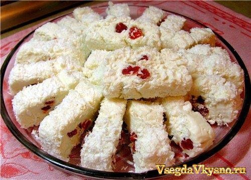 • 500 г творога (чем жирнее, тем лучше) • 10 г желатина • 100 г белого шоколада • 50 г сливочного масла • 100 г вяленой ягоды (вишня, черешня, клубника и пр.) • 100 г кокосовой стружки • 2 ст.л. сахара |