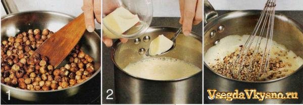 Способ приготовления: 1. Орехи обжарить, помешивая, на сухой сковороде, 2-3 мин. Отложить немного для украшения, оставшиеся размолоть в блендере в мелкую крошку.