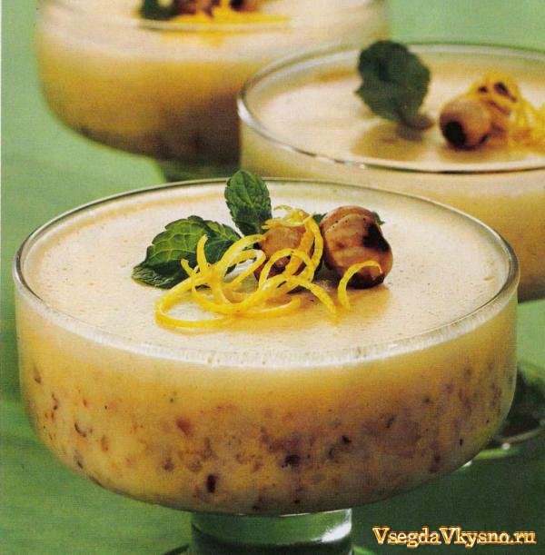 3. Всыпать орехи и аккуратно перемешать. Разложить крем по формочкам и поставить в холодильник минимум на 1 ч. Перед подачей на стол украсить отложенными жареными орехами и листиками мяты.