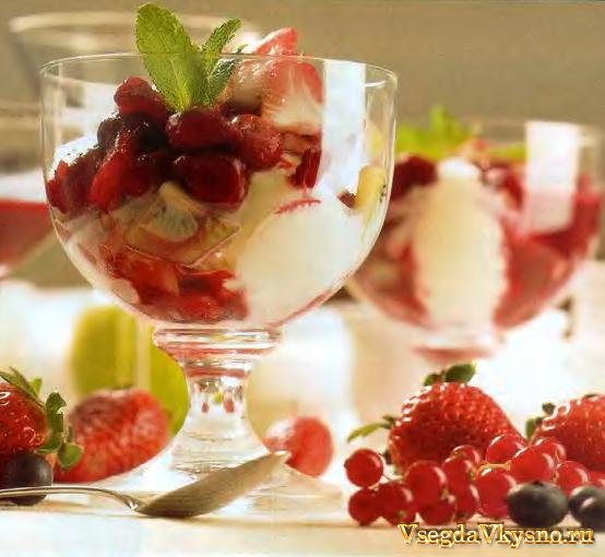 Ингредиенты: Мороженое сливочное - 100 г Красное вино (сладкое или полусладкое) - 30 мл Коньяк - 30 мл Ягоды и фрукты (вишня или черешня, клубника, киви, можно замороженные) - 300 г