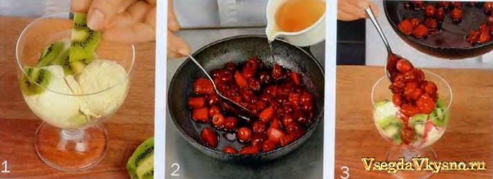 3 Не давая остыть, кипящей смесью залить мороженое и сразу же подавать. |