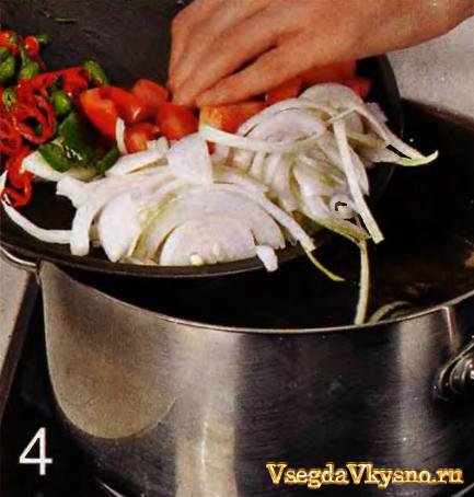 4. Помидоры вымыть. Оставшийся репчатый лук очистить, у острых перчиков удалить сердцевину. Помидоры нарезать крупными кусками, лук тонкими полукольцами, острый перчик колечками. Добавить овощи в бульон, поставить его на огонь. Дать закипеть, убавить огонь до минимума и варить 15 мин.