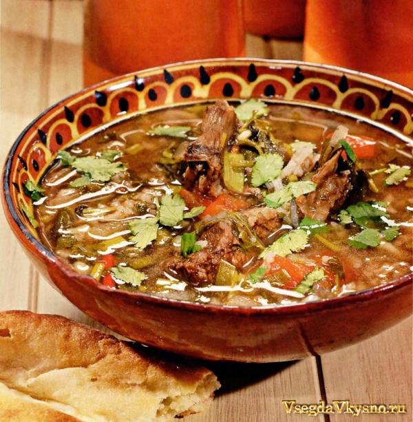 Ингредиенты: 700 г говяжьей грудинки 200 г помидоров 3 луковицы 2 морковки 50 г корня сельдерея 1 корень петрушки 5 ст. л. длиннозерного риса 1 красный острый перчик 1 зеленый острый перчик 4 ст. л. соуса ткемали 2 ст. л. сахара 1 ст. л. хмели-сунели 0,5 ст. л. черного перца горошком 0,5 ст. л. душистого перца горошком 4 лавровых листа пучок зеленого лука по 2-3 веточки кинзы, петрушки и базилика соль