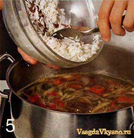 5. Рис хорошенько промыть в нескольких водах. Добавить в суп вместе с ткемали и хмели-сунели, готовить еще 15 мин.