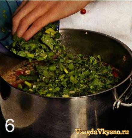 6. Зеленый лук, кинзу, петрушку и базилик вымыть, обсушить и мелко нарезать. Чеснок очистить, измельчить. Положить в кастрюлю зелень, чеснок и сахар. Снять суп с огня, накрыть крышкой и дать постоять 15-20 мин. |