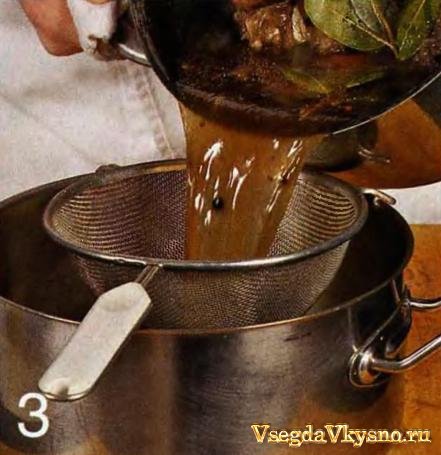 З. Мясо переложить в чистую кастрюлю, влить процеженный бульон.