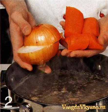 2. Корень сельдерея, корень петрушки и морковь очистить. Морковь и 1 неочищенную луковицу разрезать пополам, корень сельдерея нарезать кусками. Добавить овощи в кастрюлю и варить 1,5 ч на среднем огне. За 20 мин. до окончания варки добавить лавровые листья, щепотку соли, горошины черного и душистого перца.