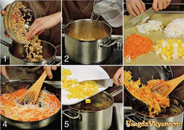 5. Картофель и пастернак положить в кастрюлю с перловкой. Варить 7 мин.