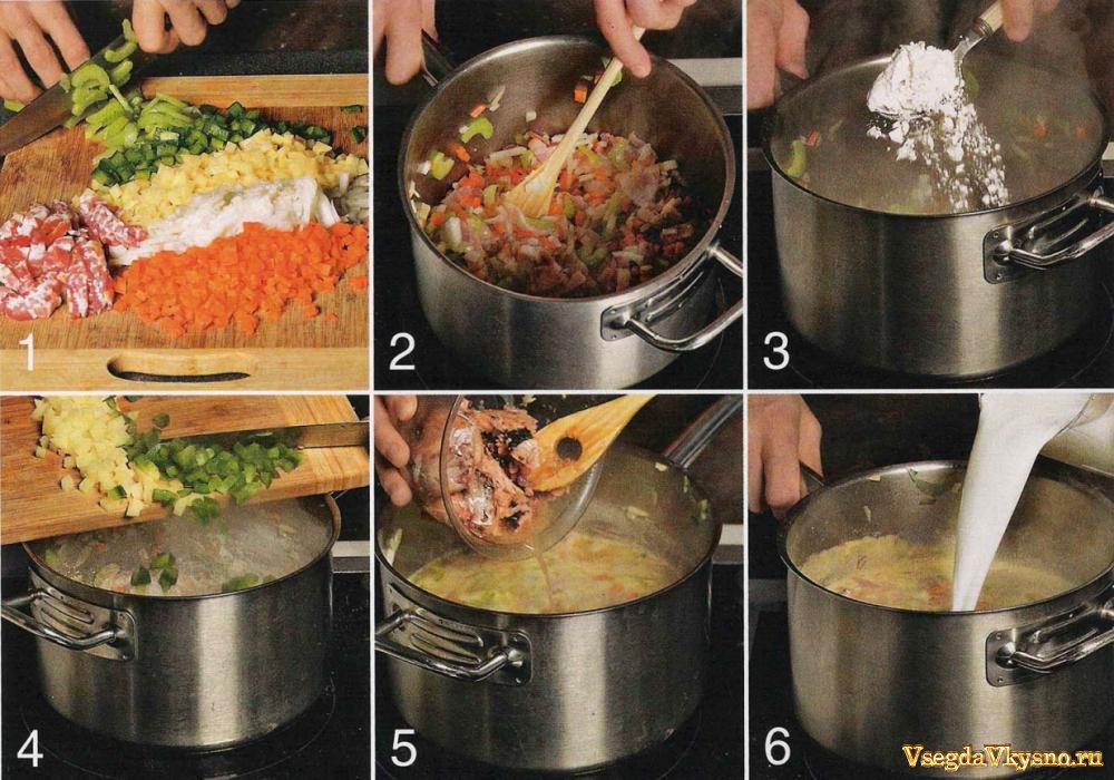 Способ приготовления:1. Картофель, морковь и репчатый лук очистить, нарезать очень маленькими кубиками. Сельдерей и сладкий перец вымыть, сельдерей нарезать тонкими ломтиками, перец - небольшими кубиками, предварительно удалив сердцевину. Бекон измельчить.
