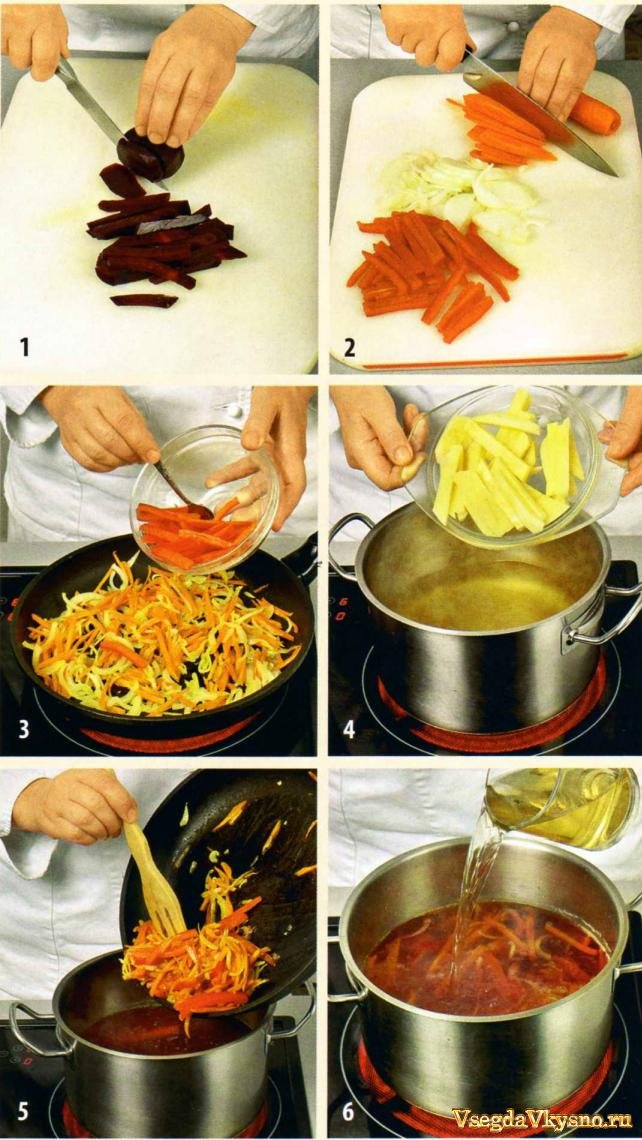 Для того чтобы цвет борща был более насыщенным, можно натереть на терке 1 сырую свеклу, залить ее водой, добавить уксус, довести до кипения и дать настояться. Приготовленный настой влить в борщ в конце приготовления.