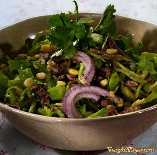 3 . Выложить салат в миску, сверху посыпать кедровыми орешками.