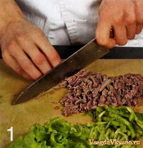 Способ приготовления:1. Лук, огурец и киви очистить, нарезать тонкой соломкой. Так же нарезать говядину. Салатные листья вымыть, обсушить и нарвать руками. Все перемешать.