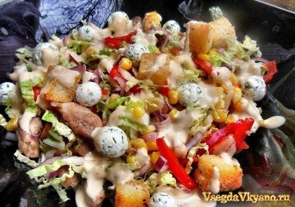 Греховно вкусный салат из пекинской капусты, курицы и крутонов с оригинальной заправкой.