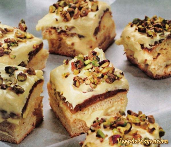 6. Накрыть вторым пластом, смазать оставшимся кремом. Нарезать корж квадратами. Отложенные орехи порубить и присыпать ими пирожные. Поставить в холодильник на 2 ч.