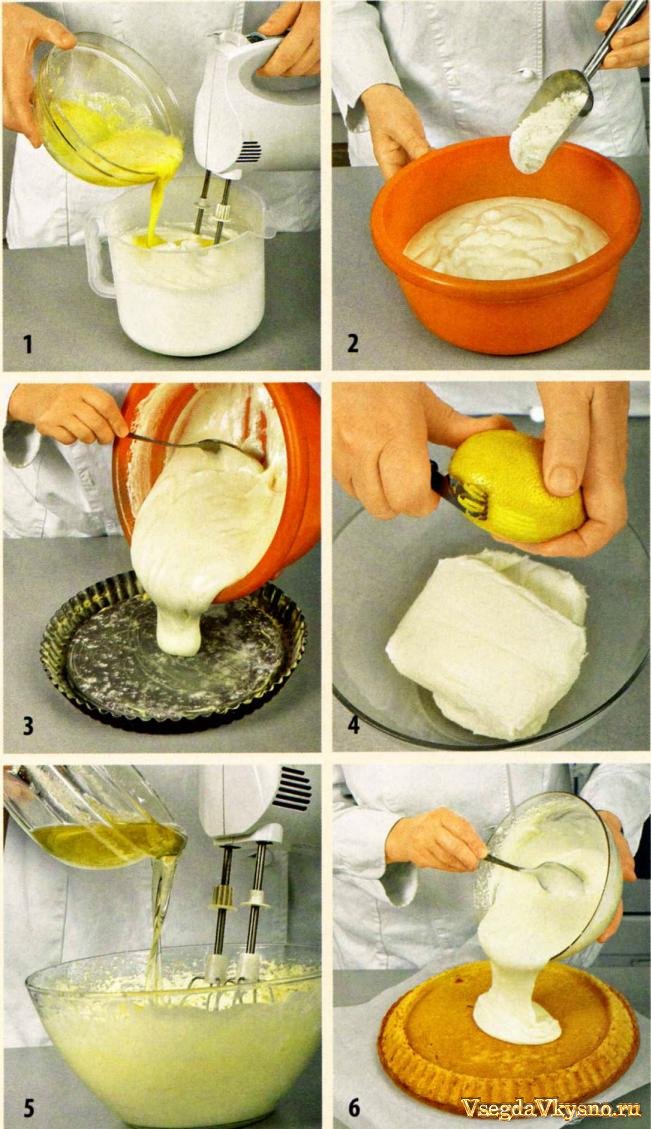 4. Желатин замочить в 150 мл холодной воды и дать ему набухнуть. Для приготовления крема творог смешать с тертой лимонной цедрой и сахаром. Охлажденные сливки взбить в пышную массу и соединить с творогом.