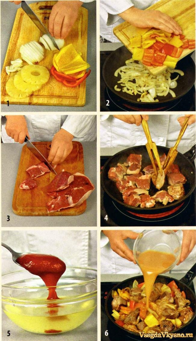 Способ приготовления:1. Репчатый лук очистить и нарезать полукольцами. Зубчики чеснока очистить и разрезать на 4 части. Стручки сладкого перца разрезать пополам, удалить плодоножку и семена и нарезать перец квадратными кусочками со стороной около 3 см. Консервированные ананасы нарезать небольшими кусочками.