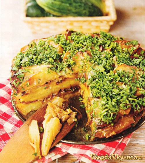 5. Выложить оставшийся картофель, смазать маслом и приправить солью. Посыпать сверху паприкой. Накрыть фольгой и поставить в разогретую до 200 °С духовку на 1 ч. За 10 мин. до готовности снять фольгу, чтобы картофель подрумянился. Подавать теплым. Перед подачей посыпать рубленой зеленью. В качестве соуса можно подать сметану. |