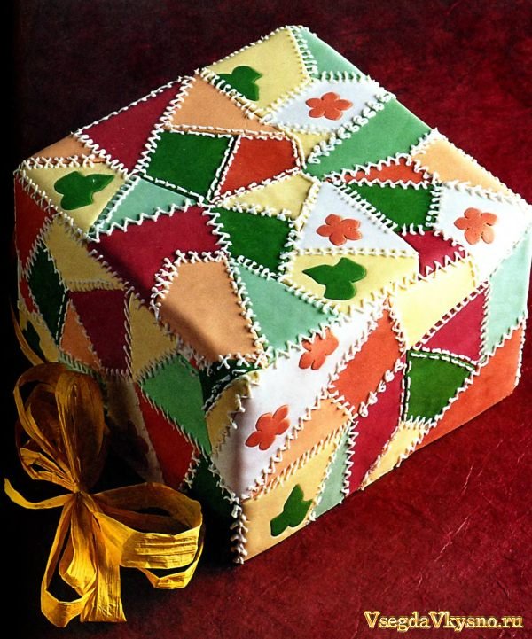 Такой торт подойдет для подруги, увлекающейся рукоделием (а именно пэчворком), или если вы захотите поразить друзей вашим мастерством. Рисунок навевает мысли о лоскутных одеялах («безумный лоскуток») американских колонистов, которые сшивали грубыми поверхностными швами цветные лоскуты ткани и получали яркие покрывала. |