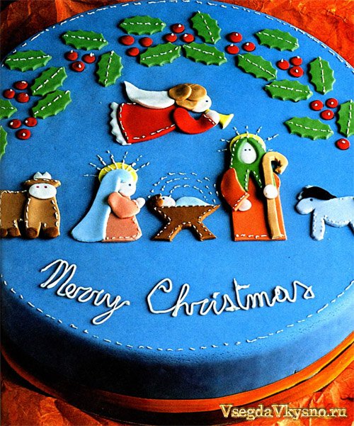 Большой торт для празднования Рождества в семейном кругу с трогательными украшениями, напоминающими аппликацию из мягкой ткани. Пунктирные линии выполнены королевской глазурью. |