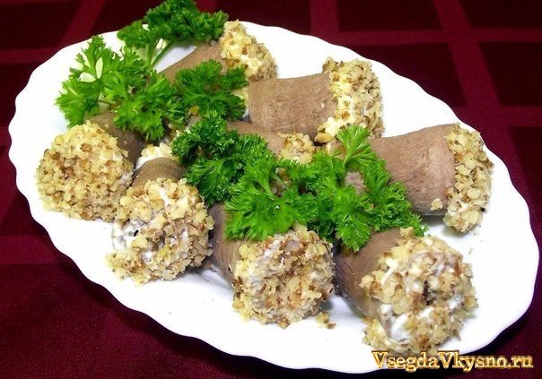 • язык - 400 грамм • репчатый лук - одна штука • шампиньоны - 150 грамм • сметана 10%- 100 грамм • чеснок - 3 дольки • измельченные грецкие орехи - две столовых ложки • соль - по вкусу • черный молотый перец - по вкусу • грецкие орехи - для украшения |