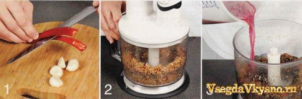 2. Пропустить через мясорубку или измельчить в блендере орехи, перчик и чеснок. Добавить к получившейся массе хмели-сунели, кориандр и шафран. Тщательно перемешать.